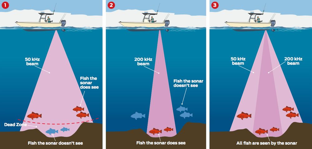 A narrower cone focuses the transmitted energy to more precisely locate small details, such as fish or bottom structure, but examines a portion of lower water.