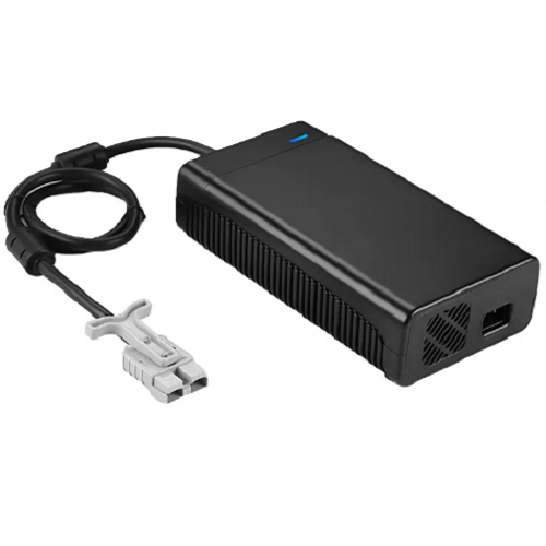 24-Volt-Lithium-Akkuladegerät. Ladekapazität 15 Ampere Ebenfalls im Lieferumfang enthalten sind zwei Kabel mit einem Stecker zum Anschluss an das Ladegerät an einem Ende und zwei Ösen zum Anschluss an die Batterie am anderen Ende.