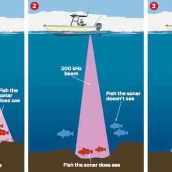 Un cono más estrecho enfoca la energía transmitida para localizar con mayor precisión pequeños detalles, como peces o la estructura del fondo, pero examina una porción de aguas inferiores.
